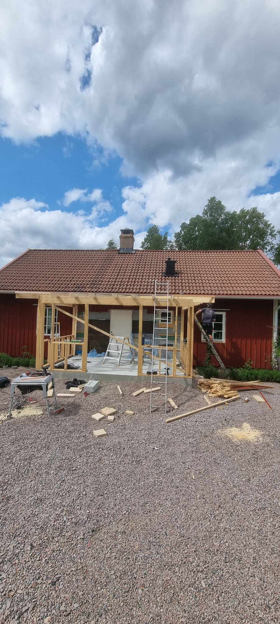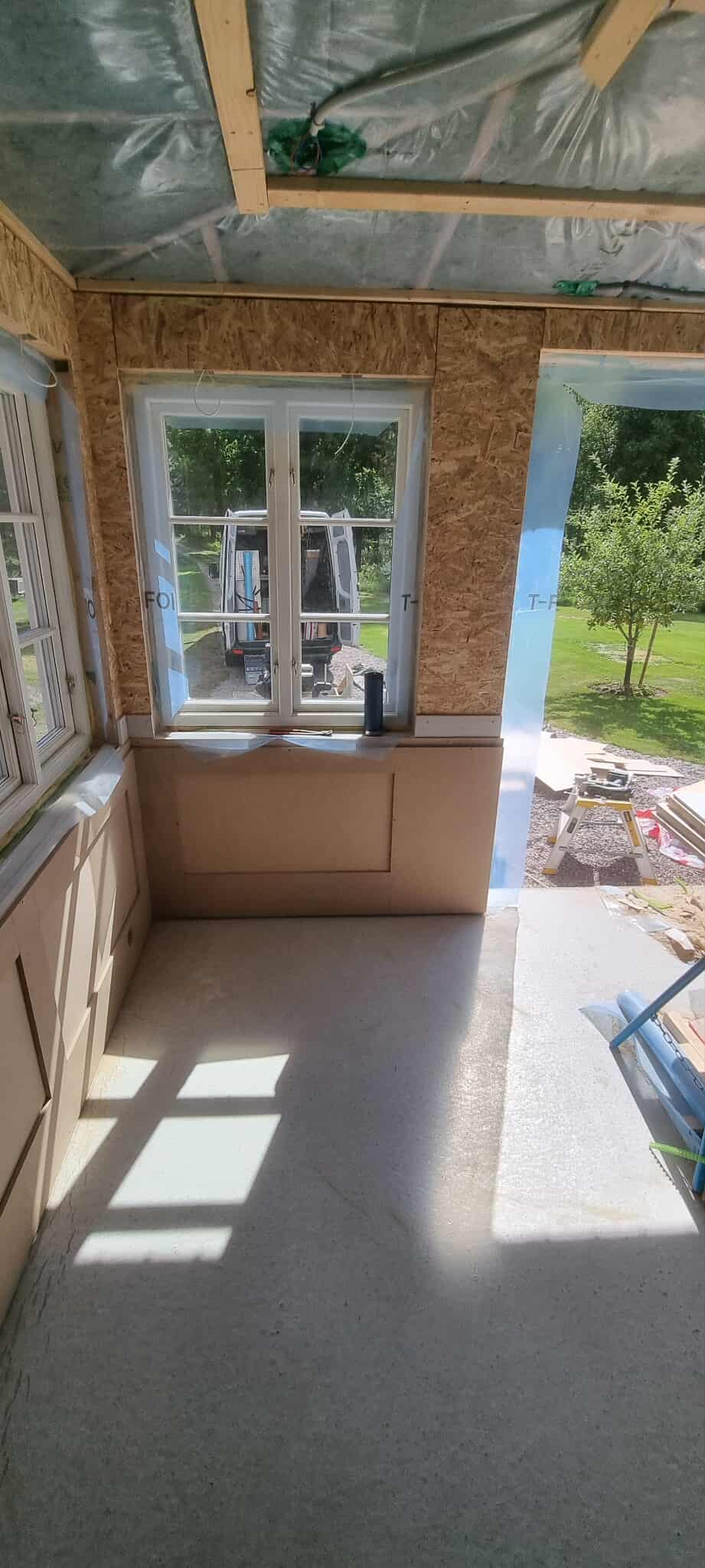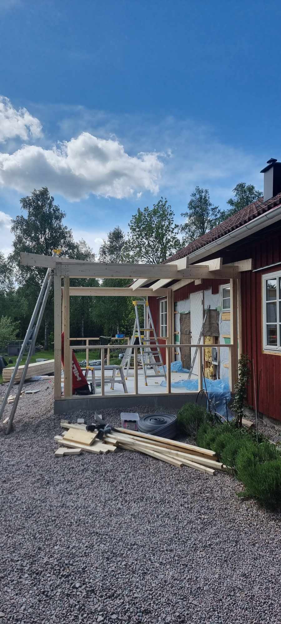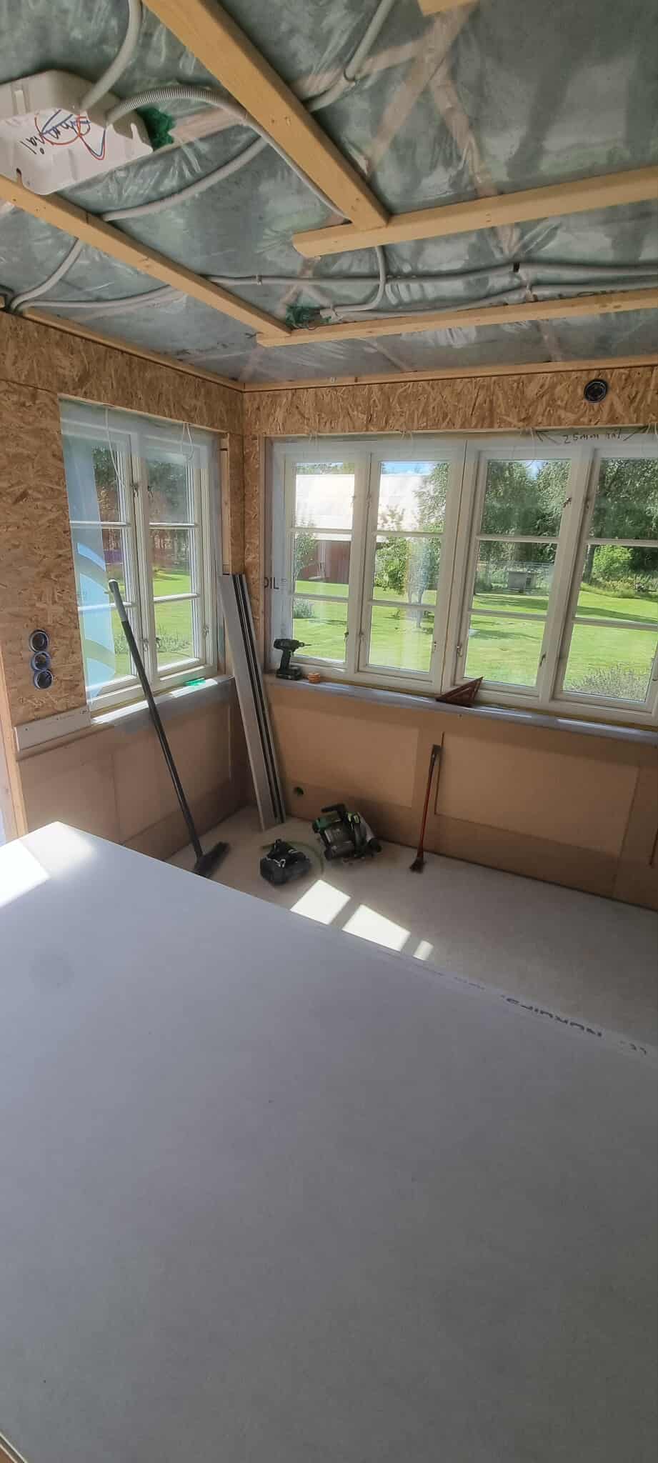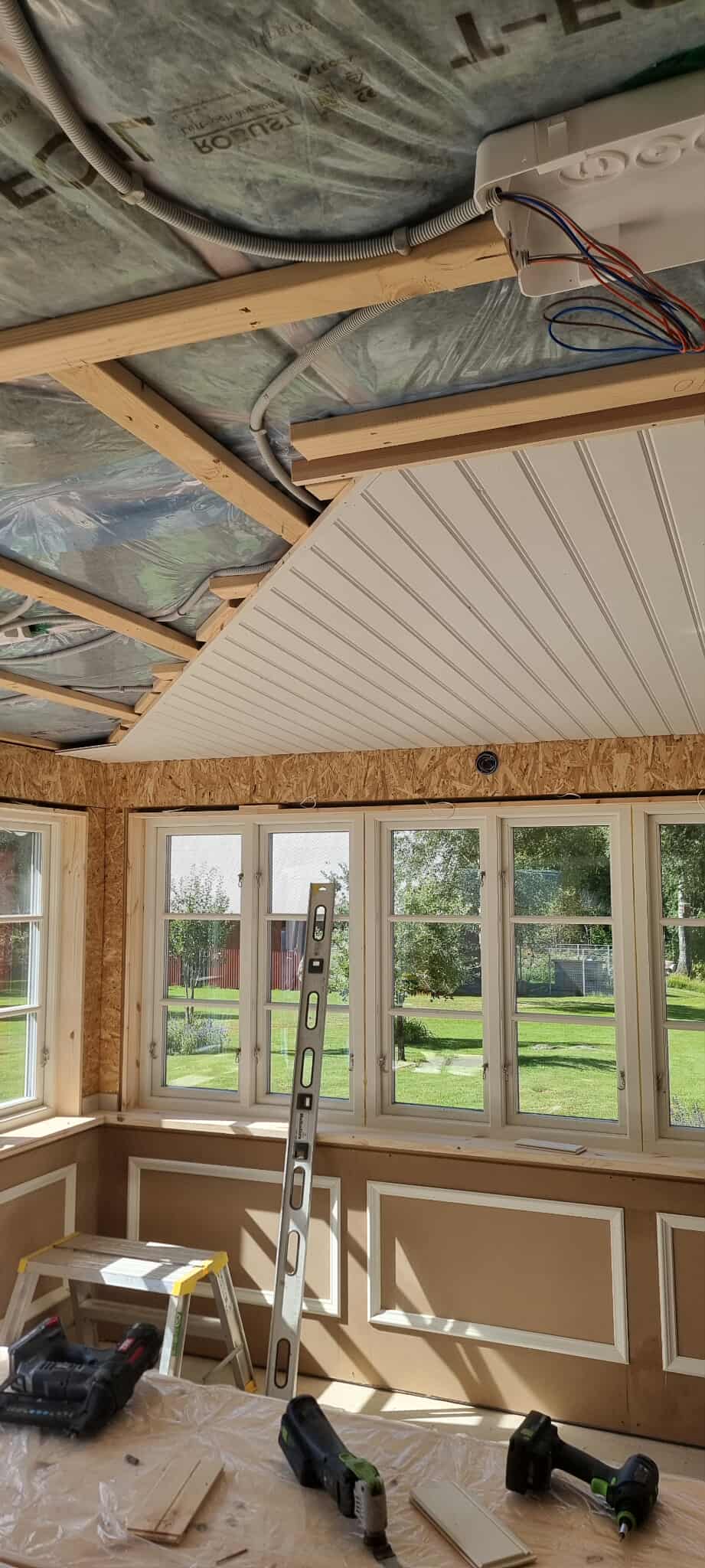 Glasveranda 20kvm.Markarbete & gjutning av grund.Resning av stomme, ställningsbygge. Brädfodring.Isolering, innerväggar, el, tak, panel, spegelpanel.Fönster och pardörr. Trappa.Klinker.