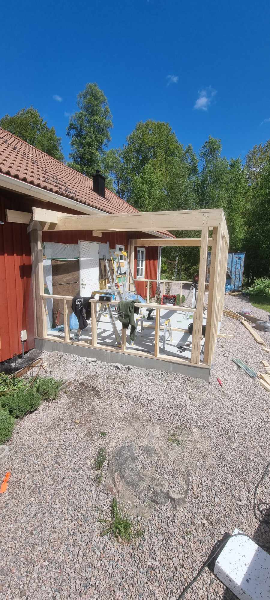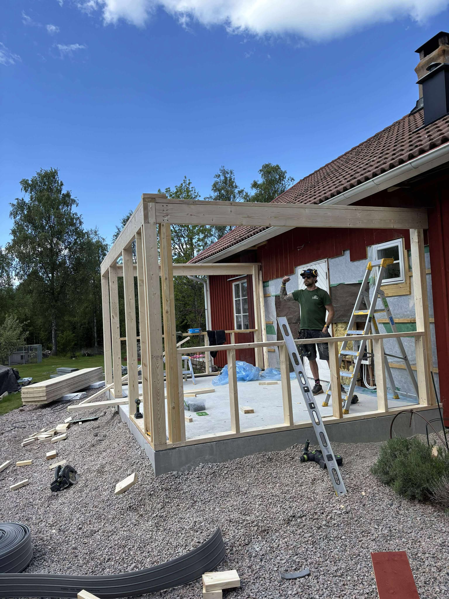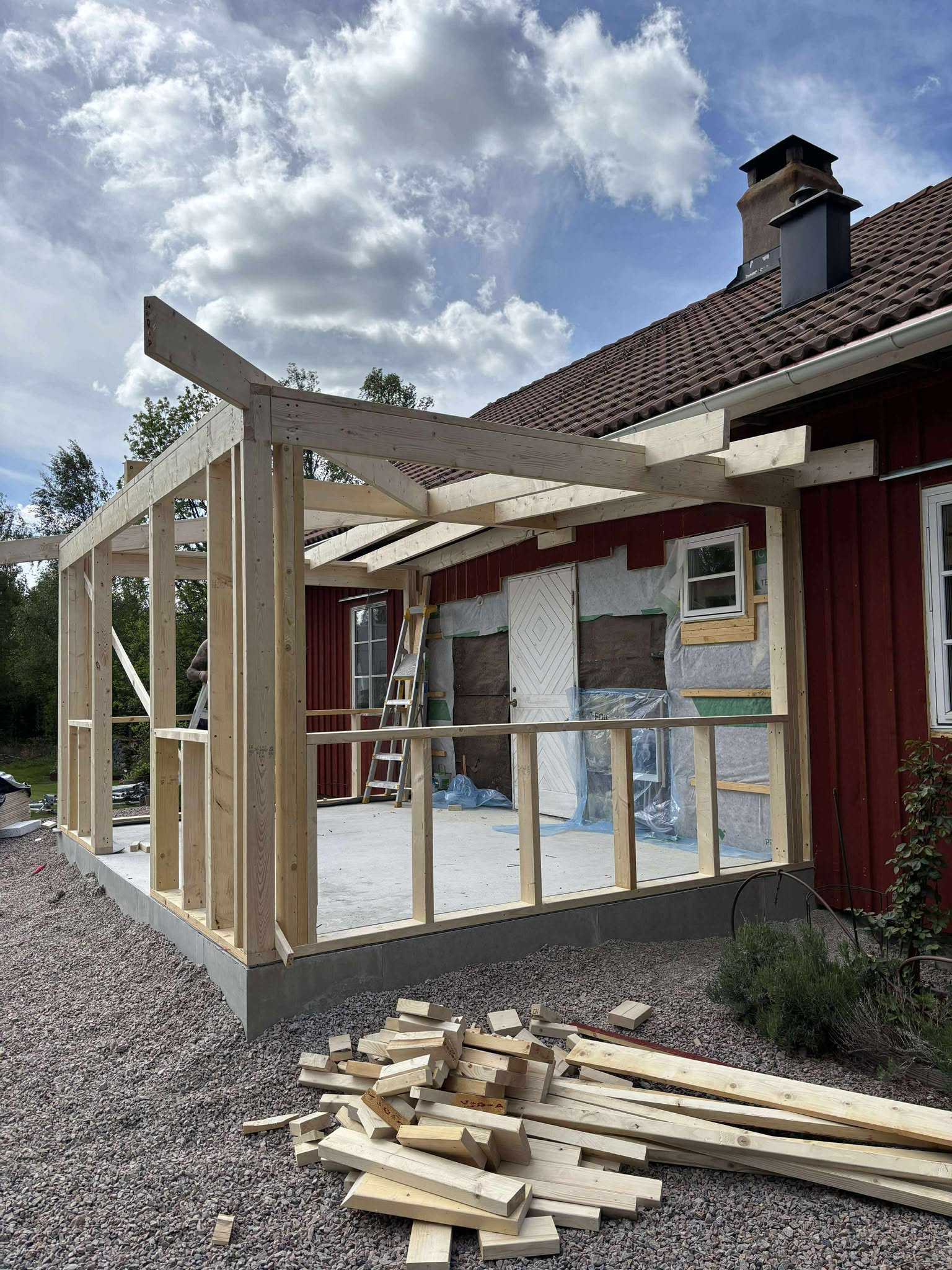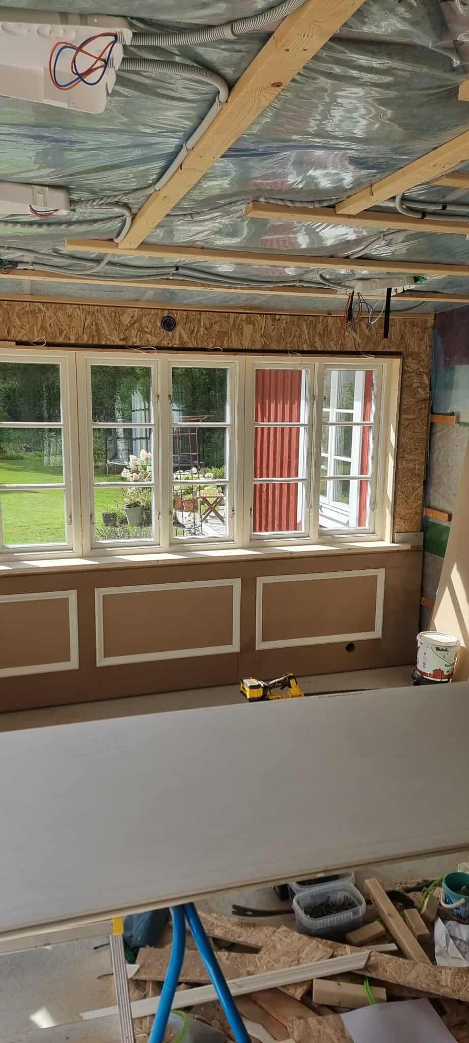 Glasveranda 20kvm.Markarbete & gjutning av grund.Resning av stomme, ställningsbygge. Brädfodring.Isolering, innerväggar, el, tak, panel, spegelpanel.Fönster och pardörr. Trappa.Klinker.