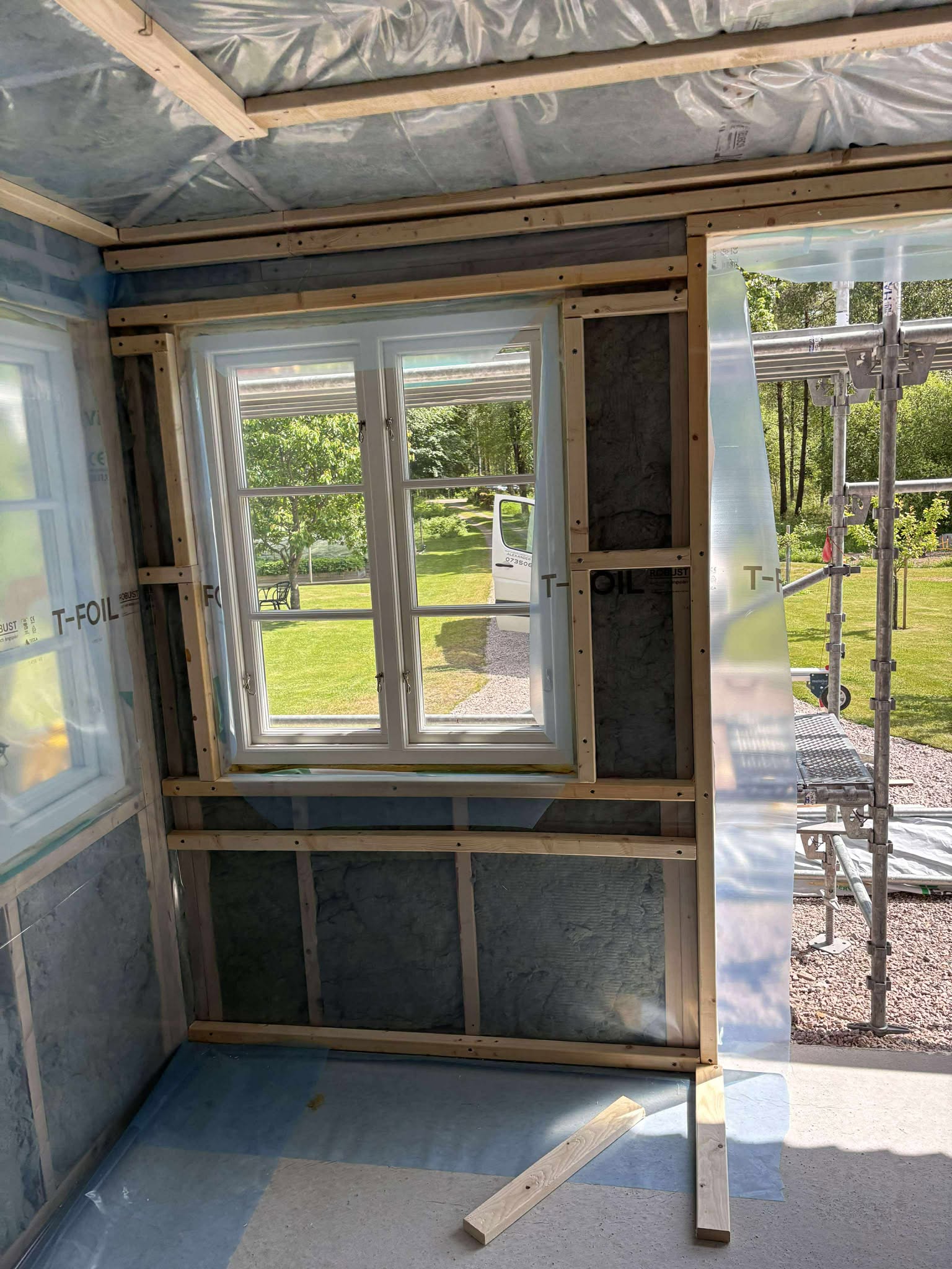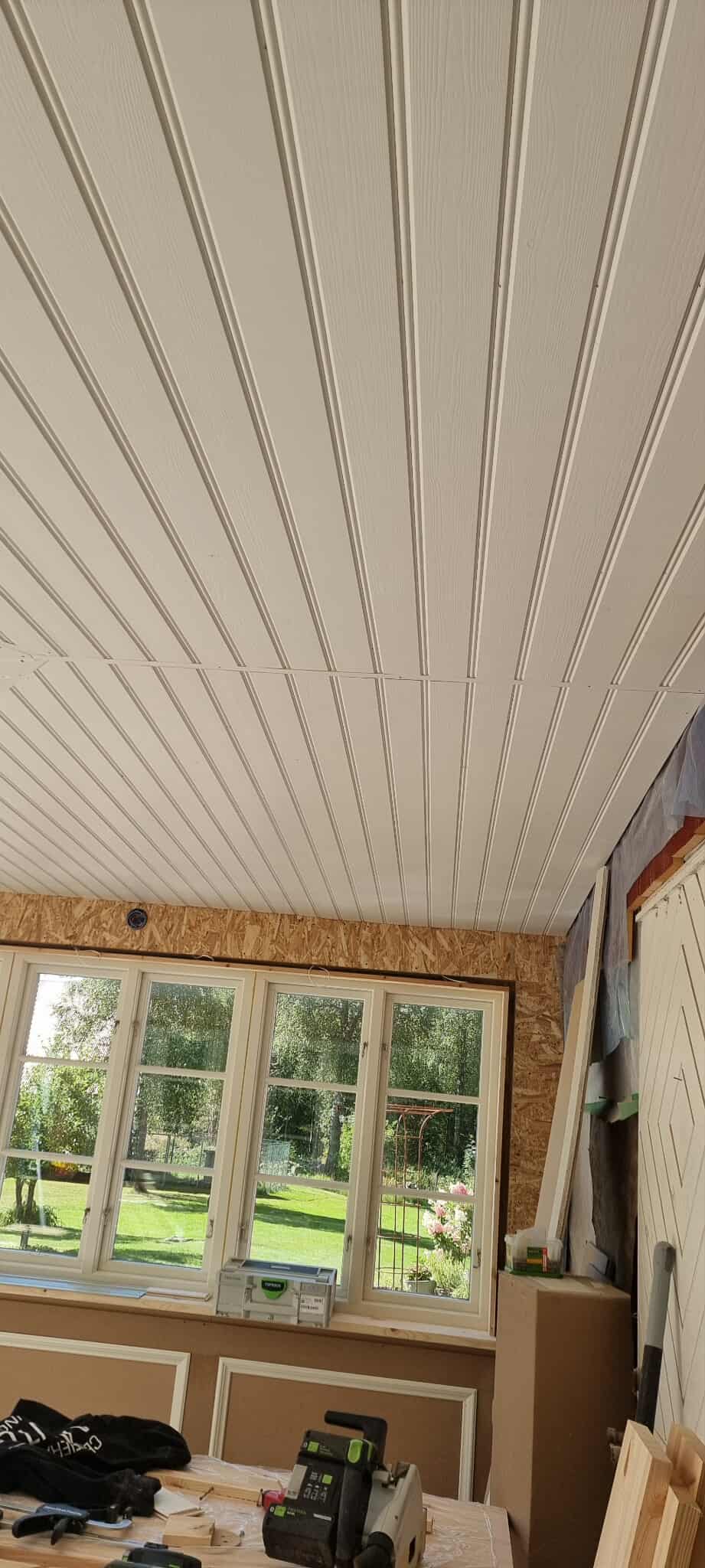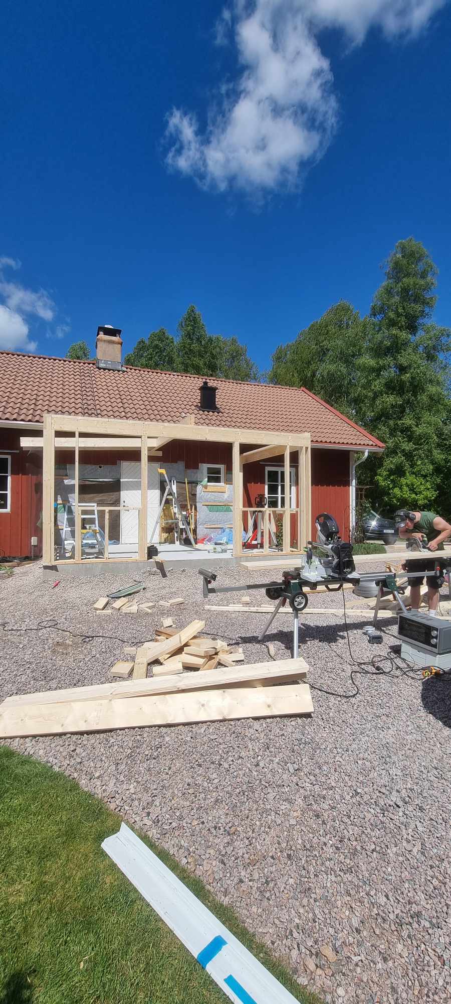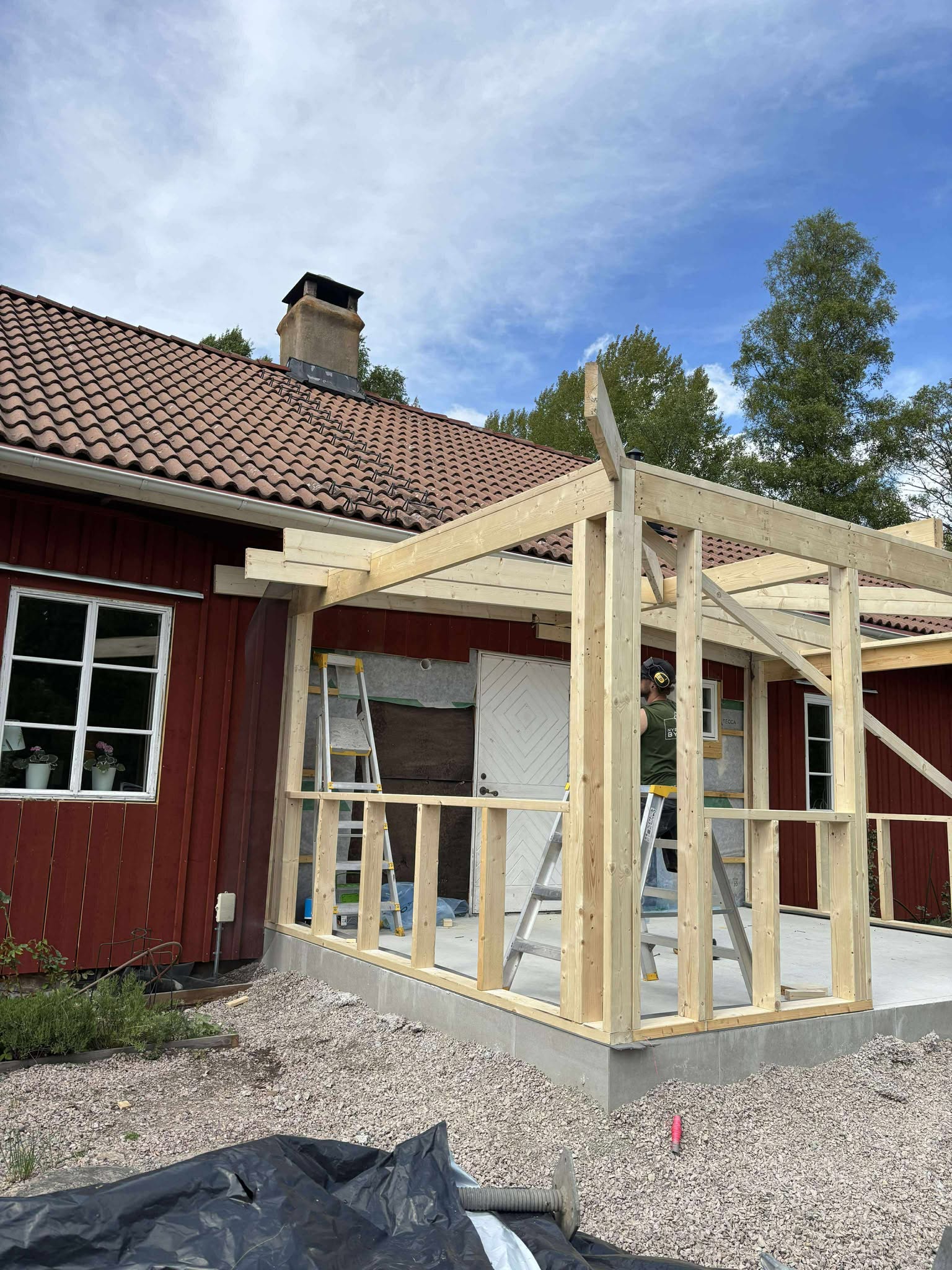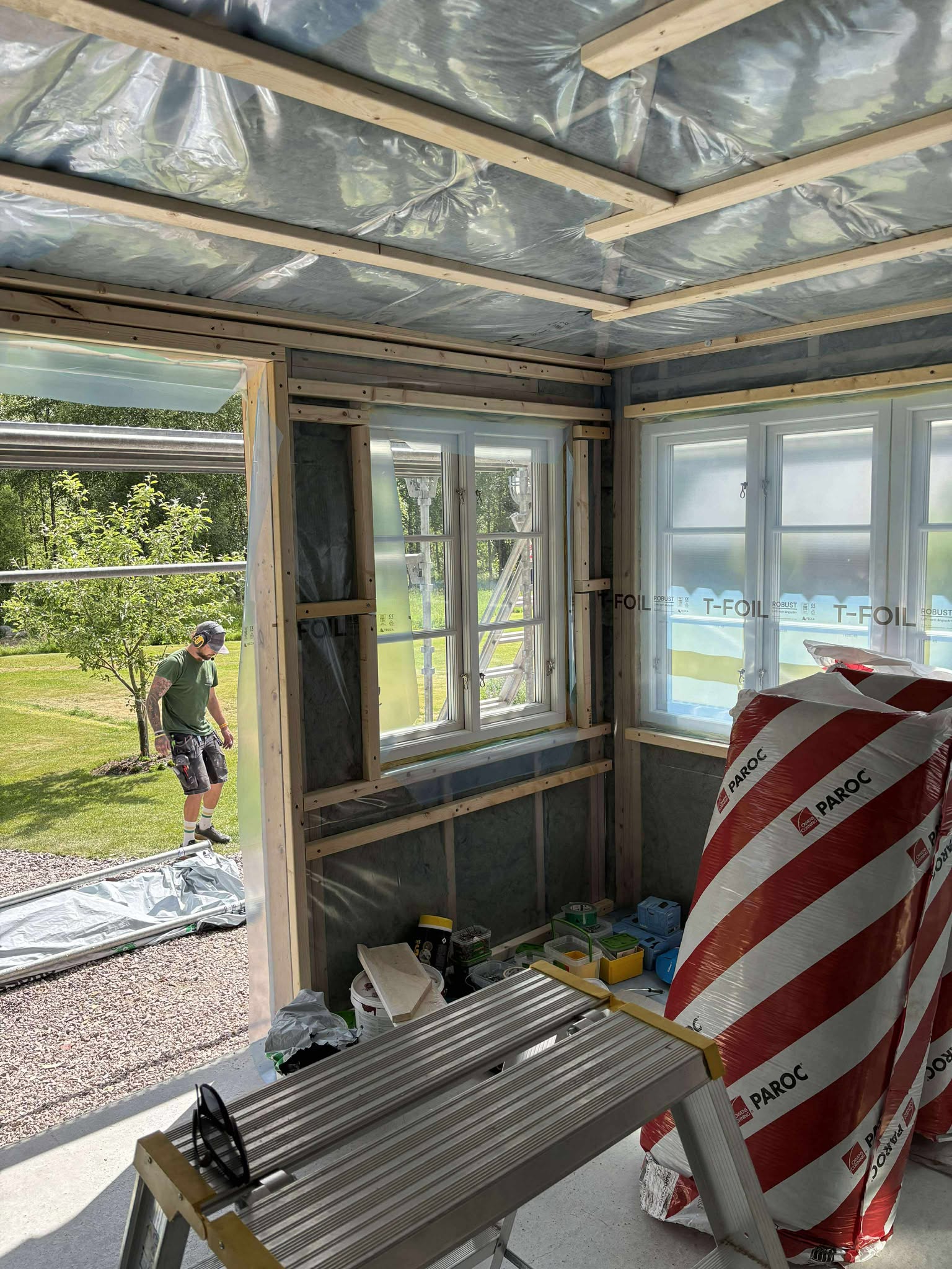 Glasveranda 20kvm.Markarbete & gjutning av grund.Resning av stomme, ställningsbygge. Brädfodring.Isolering, innerväggar, el, tak, panel, spegelpanel.Fönster och pardörr. Trappa.Klinker.