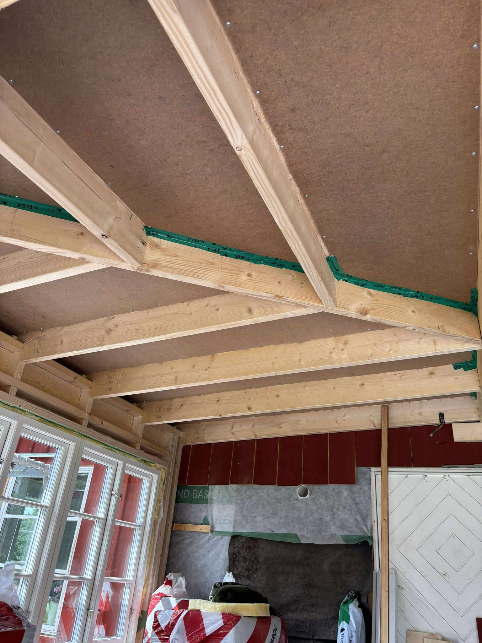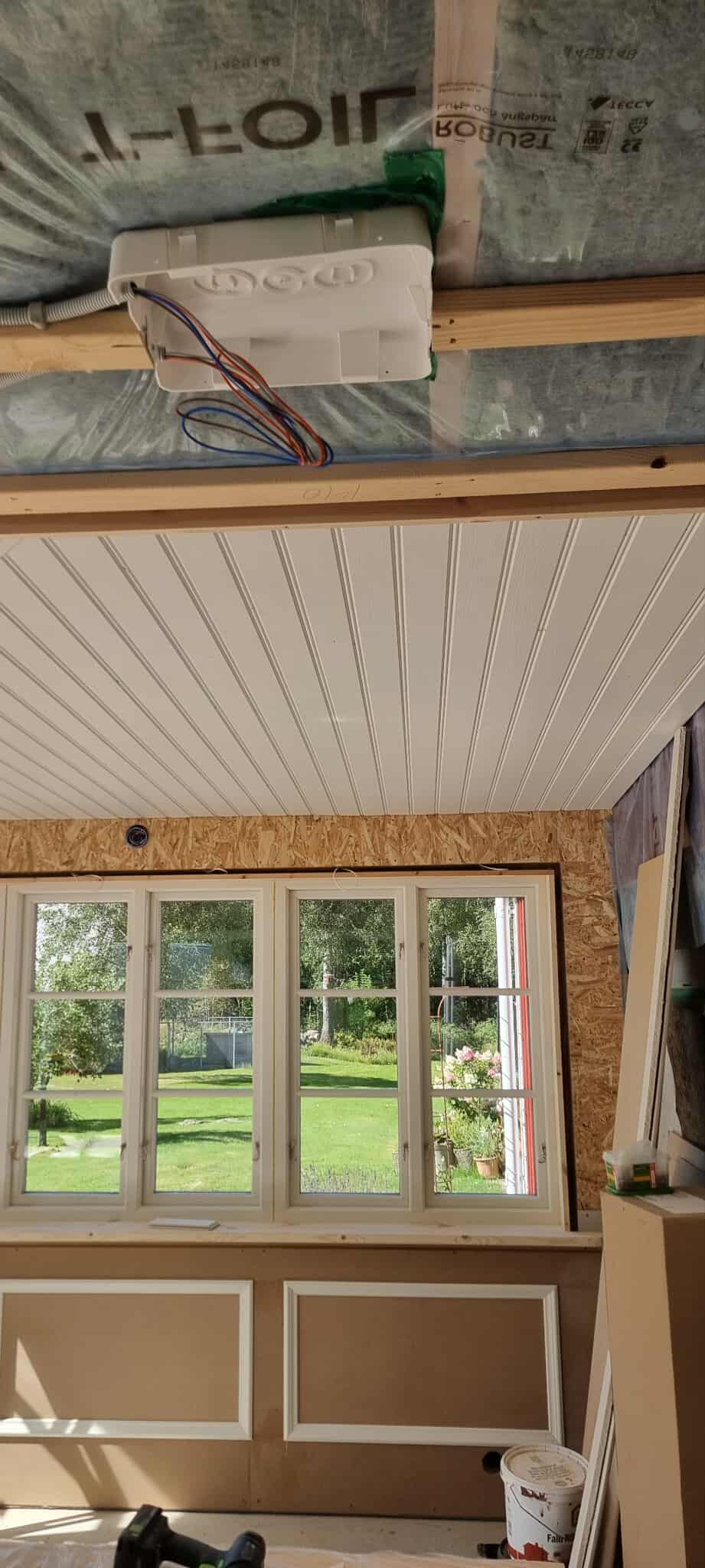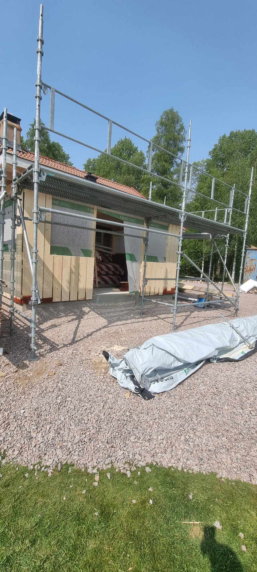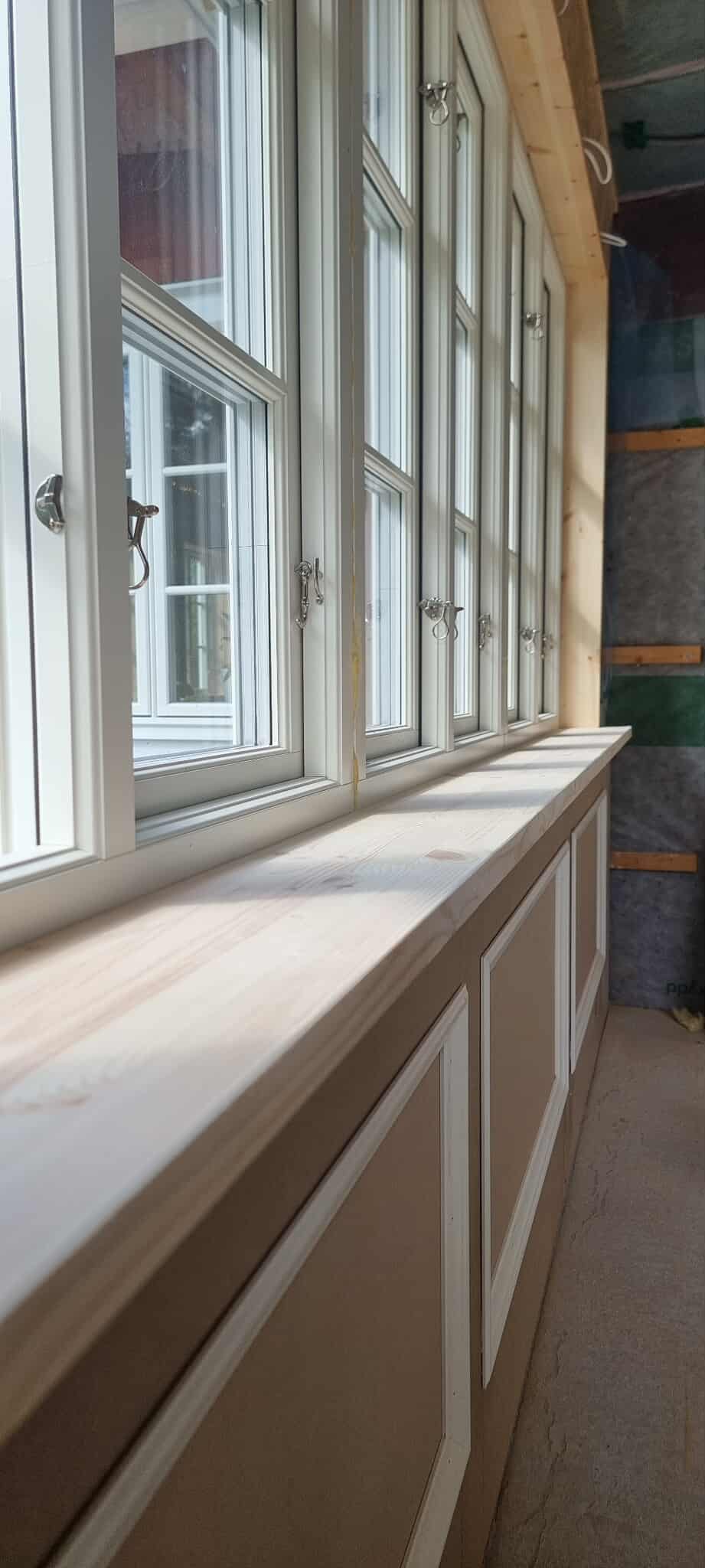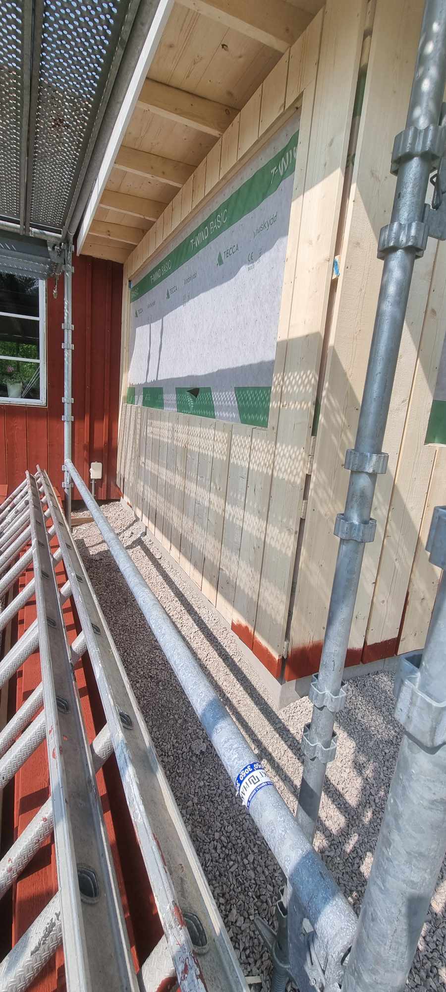 Glasveranda 20kvm.Markarbete & gjutning av grund.Resning av stomme, ställningsbygge. Brädfodring.Isolering, innerväggar, el, tak, panel, spegelpanel.Fönster och pardörr. Trappa.Klinker.