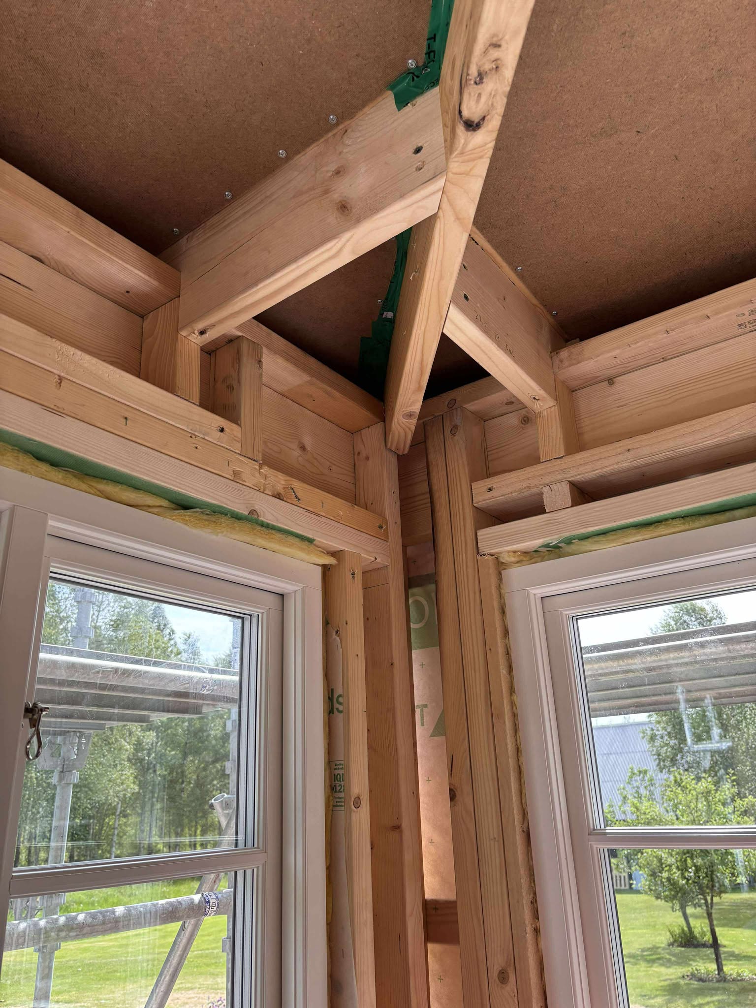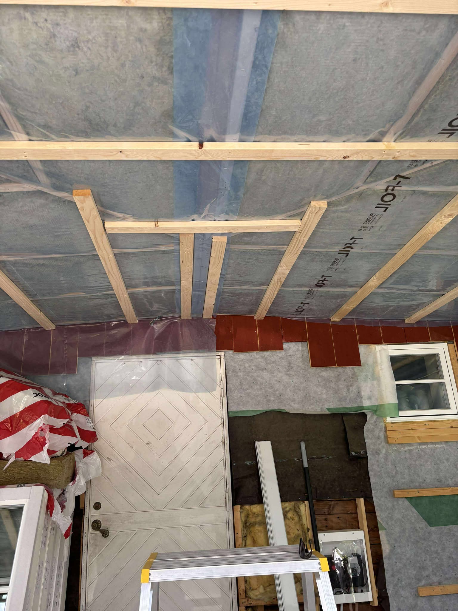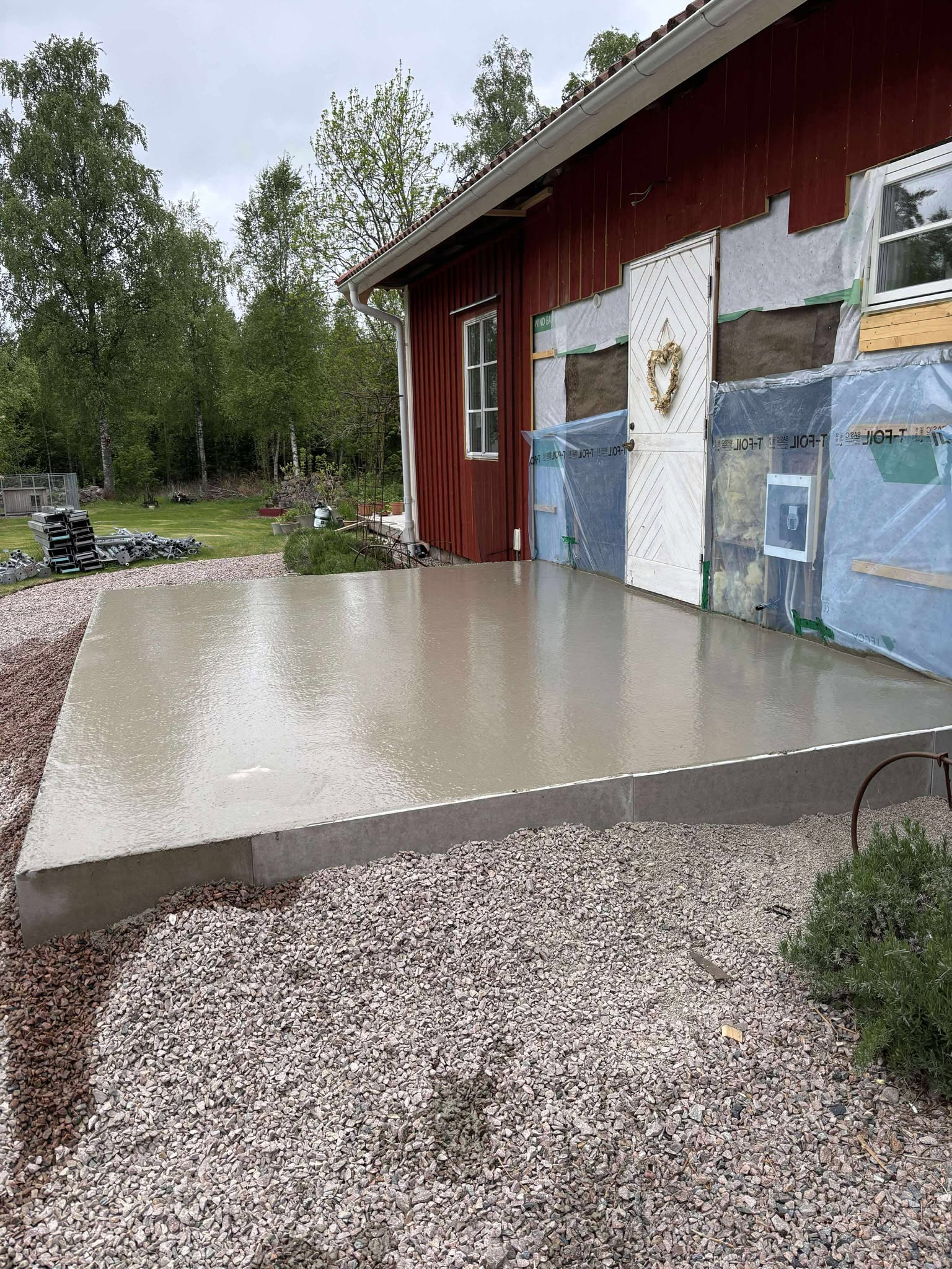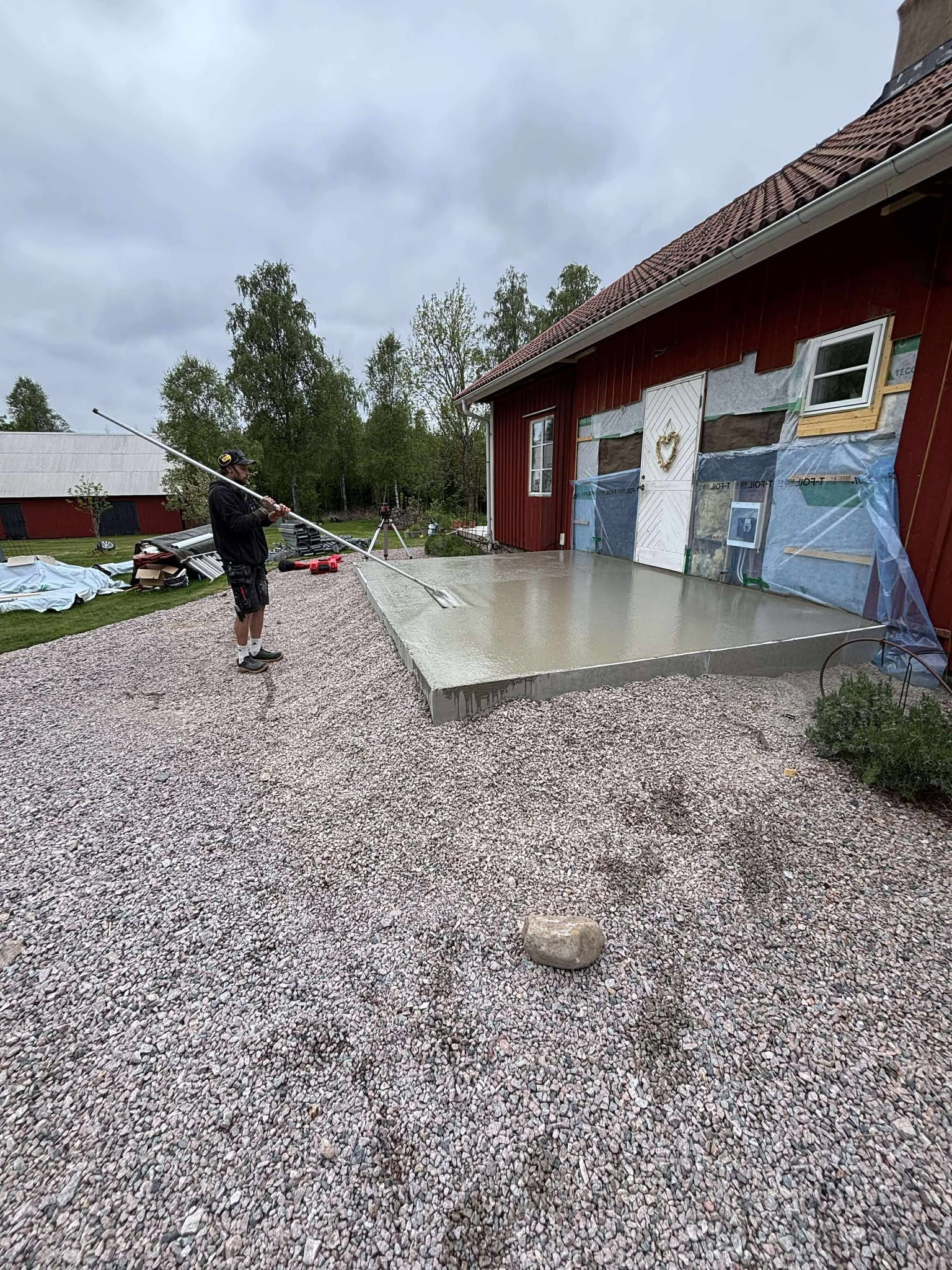 Glasveranda 20kvm.Markarbete & gjutning av grund.Resning av stomme, ställningsbygge. Brädfodring.Isolering, innerväggar, el, tak, panel, spegelpanel.Fönster och pardörr. Trappa.Klinker.