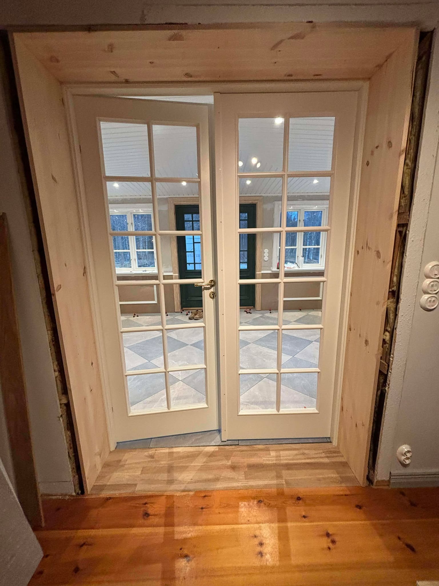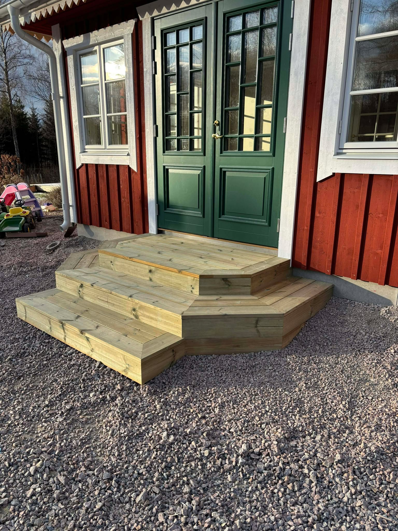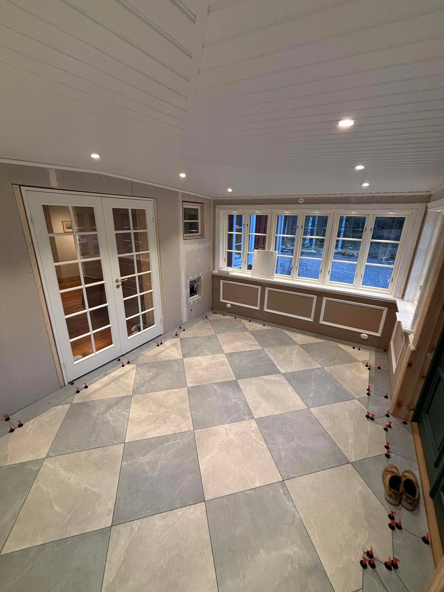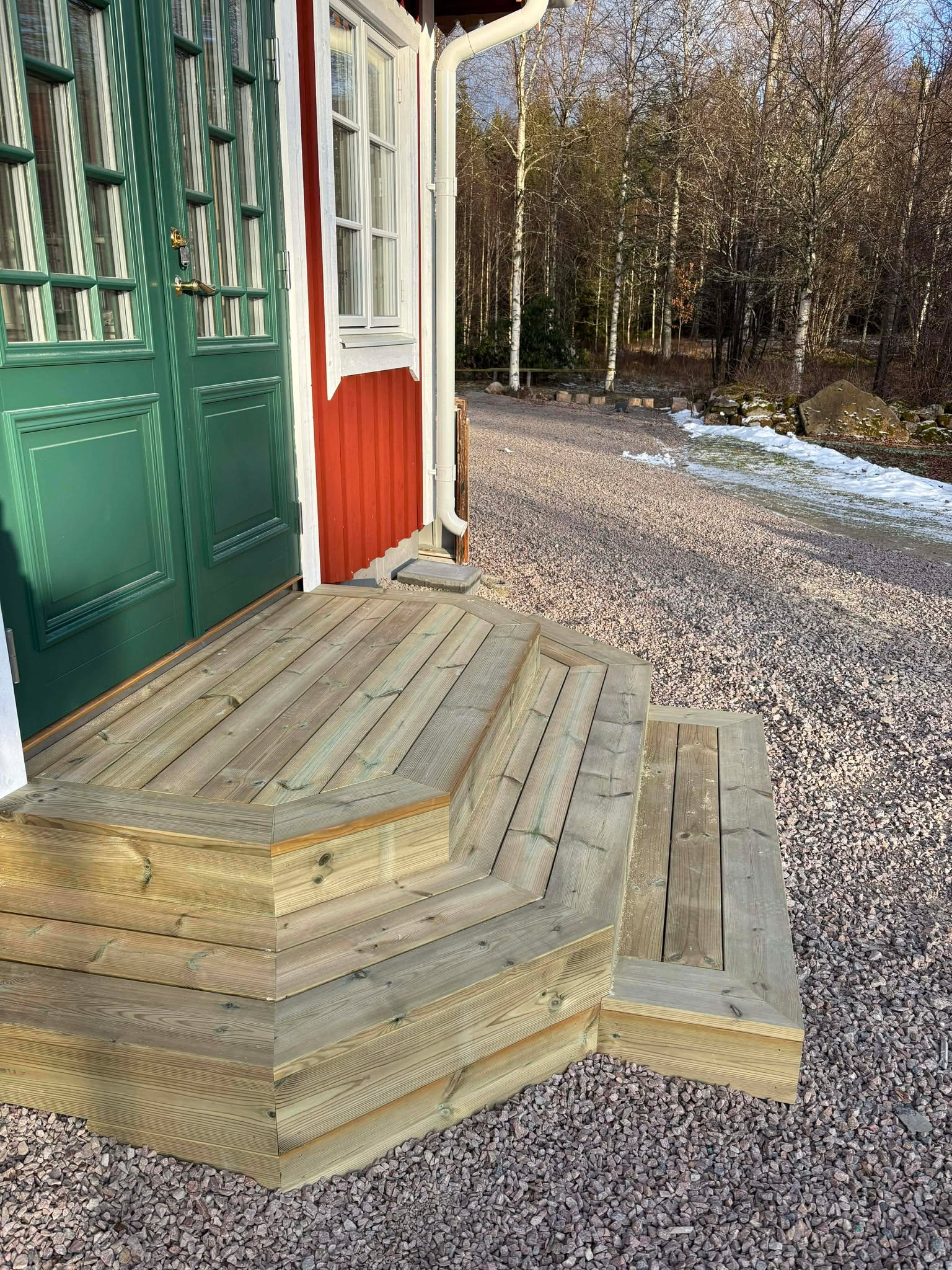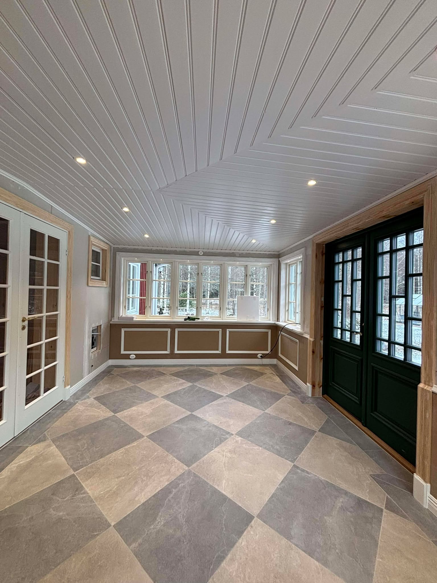 Glasveranda 20kvm.Markarbete & gjutning av grund.Resning av stomme, ställningsbygge. Brädfodring.Isolering, innerväggar, el, tak, panel, spegelpanel.Fönster och pardörr. Trappa.Klinker.